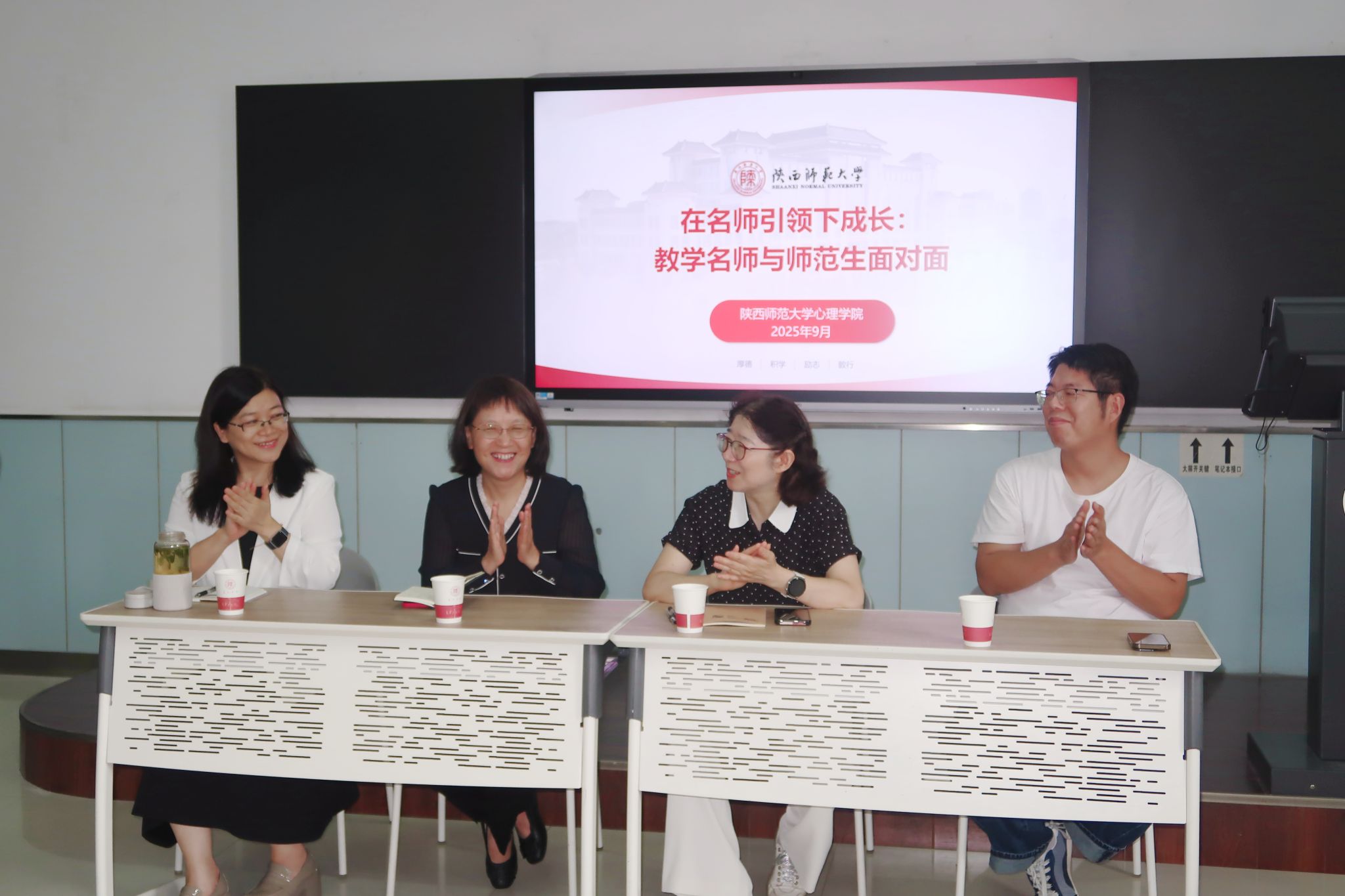 在第41个教师节来临之际,按照学校通知精神,我院于9月12日在教学四楼4403开展了主题为“大力弘扬教育家精神,加快建设教育强国”的教学名师与师范生面对面座谈交流活动。此次座谈交流活动由本科生辅导员田甜主持,2023、2024级心理学师范班班主任王丽、魏聪、学院省级教学名师王勇慧、李瑛等四位老师同2023、2024级师范班的全体同学进行了交流分享。
